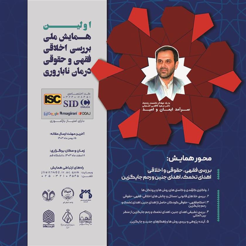 جهاد دانشگاهی استان قم در نظر دارد با همکاری مراکز دانشگاهی (دانشگاه قم و علوم پزشکی استان) و همچنین مراکز حوزوی استان، با عنایت به پیشرفت های علمی و ابداع روش های جدید در حوزه درمان ناباوری، در راستای تبادل نظر بین محققین و پژوهشگران، پاسخ به سوالات، حل چالش ها و بررسی استنباط های اخلاقی، فقهی و حقوقی مرتبط با حوزه درمان ناباروری، اقدام به برگزاری "همایش ملی بررسی اخلاقی، فقهی و حقوقی درمان ناباروری" نماید.