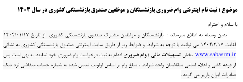 ثبت نام اینترنتی وام ضروری بازنشستگان و موظفین صندوق بازنشستگی کشوری ۲۰ فروردین ۱۴۰۴ | ۱۱:۵۹ کد : ۵۰۶۴۱ اطلاعیه ارسال به دیگران نام شما ایمیل شما ایمیل دریافتکننده ارسال انصراف تعداد بازدید:۴۳۳۶ ثبت نام اینترنتی وام ضروری بازنشستگان و موظفین صندوق بازنشستگی کشوری