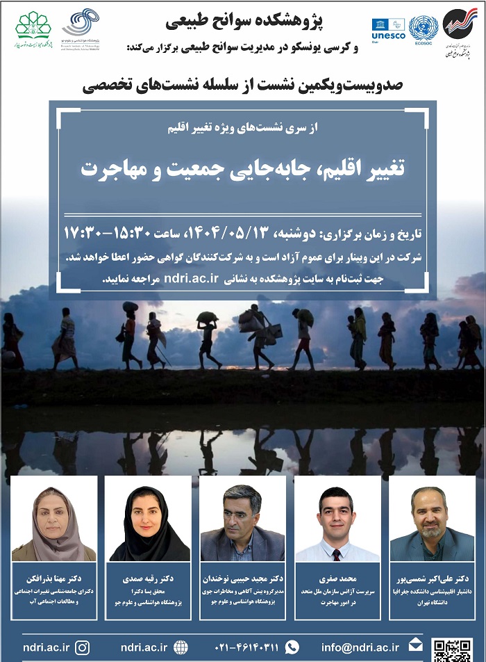 به اطلاع می رساند صدوبیست و یکمین نشست از سلسله نشست های تخصصی و از سری نشست های ویژه تغییر اقلیم با عنوان  "تغییر اقلیم جابه جایی جمعیت و مهاجرت " در روز دوشنبه مورخ ۱۴۰۴٫۰۵٫۱۳ ساعت ۱۵:۳۰ الی ۱۷:۳۰ توسط پژوهشکده سوانح طبیعی و کرسی یونسکو در مدیریت سوانح طبیعی و با حضور سخنرانان ذیل به صورت بر خط برگزار می گردد.