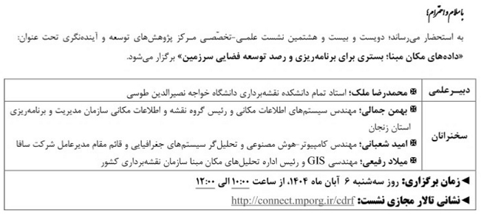 کلیدواژه‌ها: توسعه نشست مرکز نشست علمی تخصصی داده های مکان مبنا